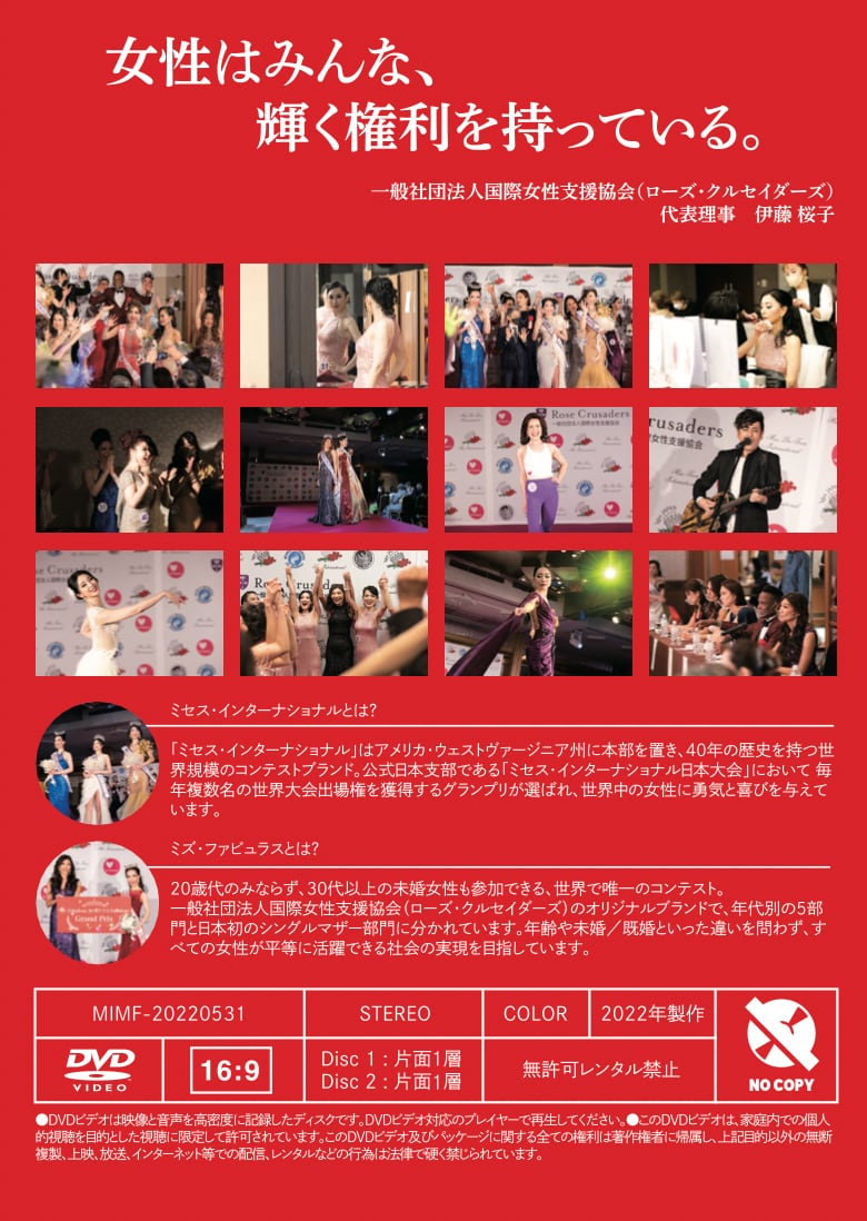 ミセスインターナショナル&ミズファビュラス日本大会2022の全てを公開します! ■オープンニング ■フィットネス ■イブニングガウン ■スピーチ など全てのパフォーマンスが満載の内容となっております。 ※送料込